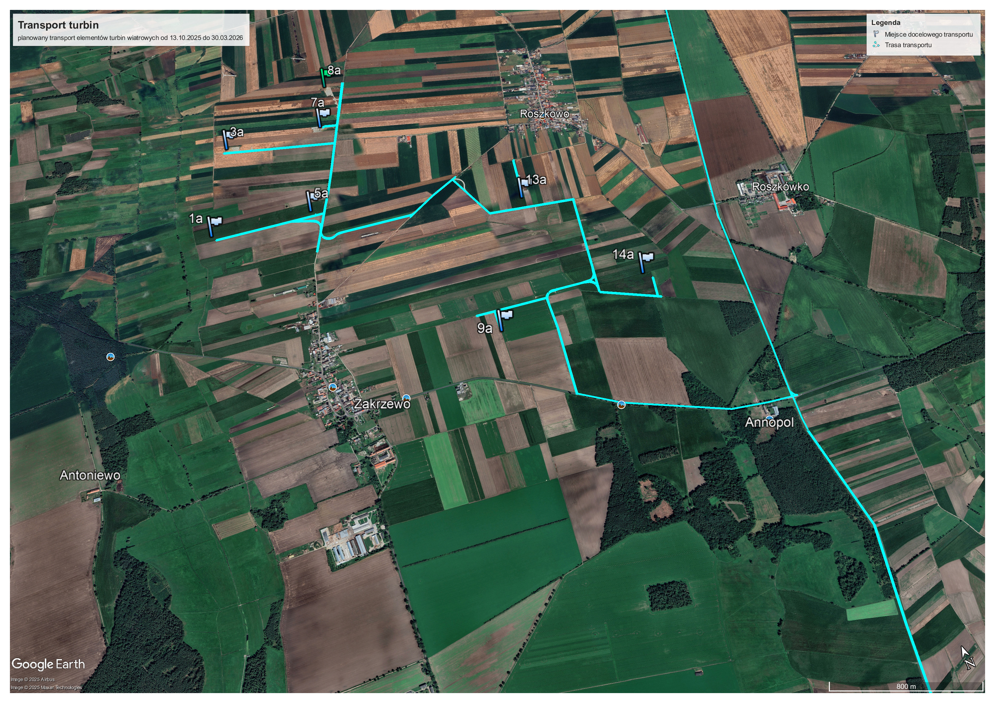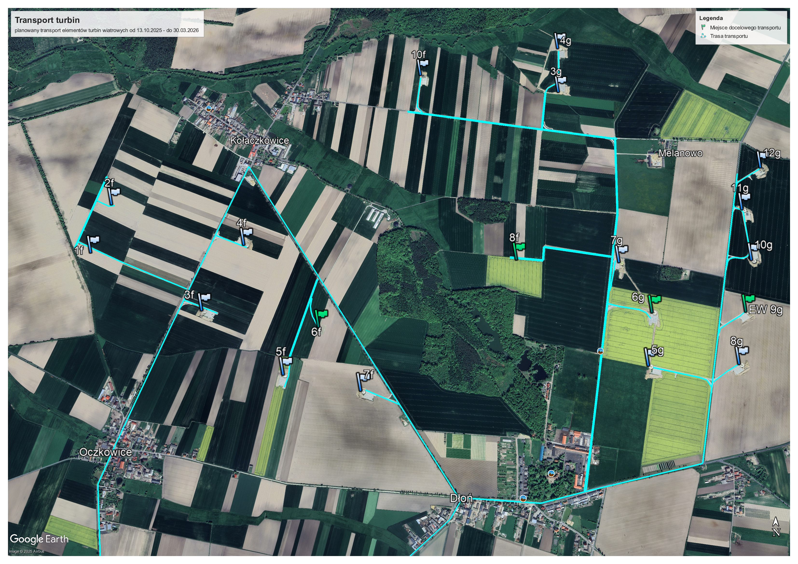Poniżej udostępniamy mapy z wizualizacjami planowanej trasy transportu turbin.