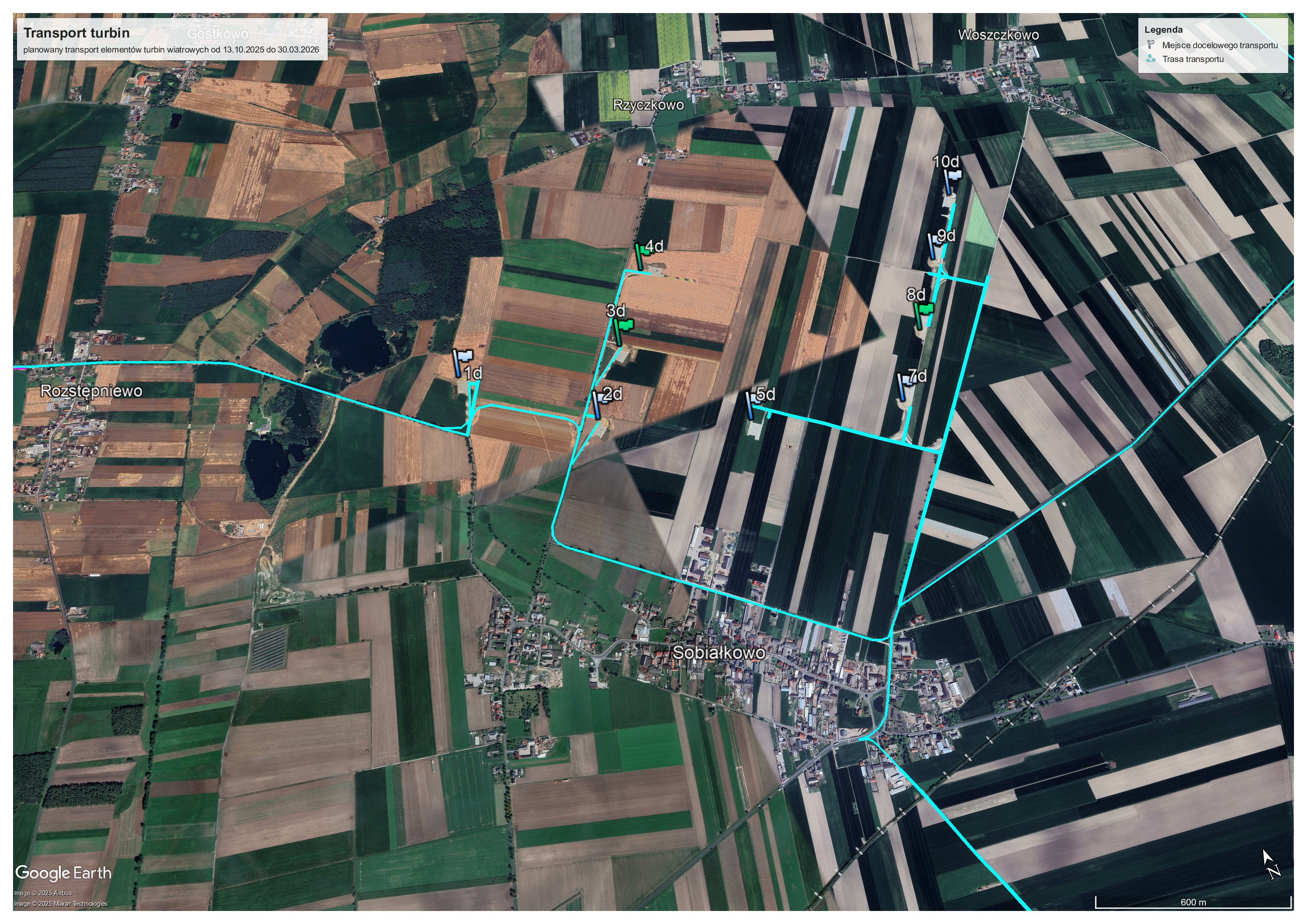 Informujemy, że w okresie od 13 października 2025 r. do 30 marca 2026 r. przez miejscowości Gostkowo, Kołaczkowice, Oczkowice, Konary , Topólka, Dłoń, Melanowo, Zmysłowo, Rozstępniewo, Roszkowo i Sobiałkowo, Annopol, będzie odbywał się transport turbin wiatrowych.