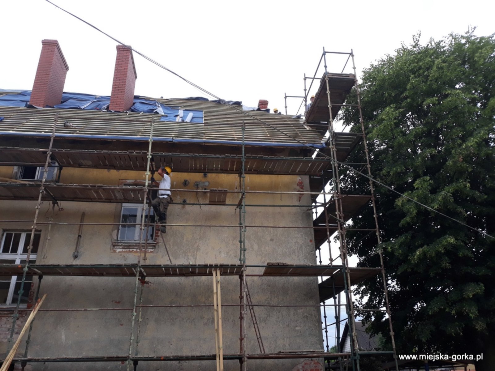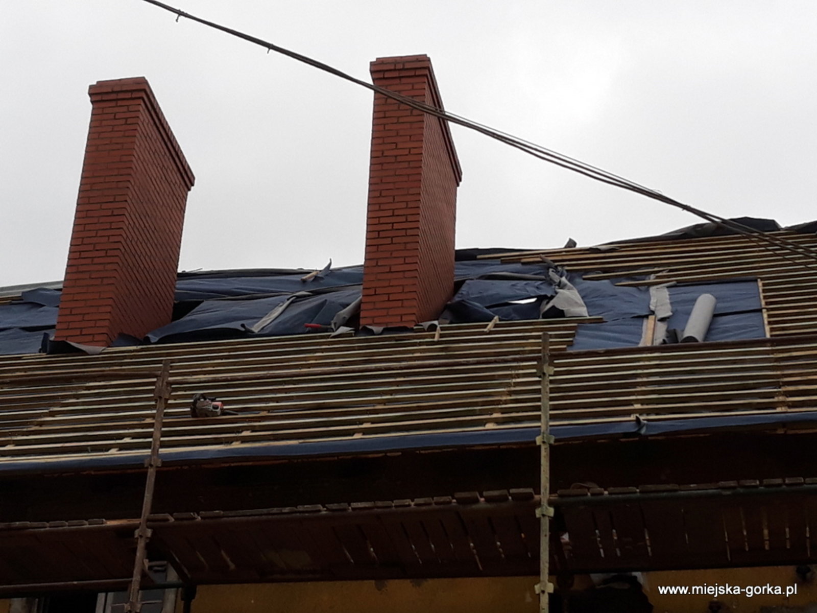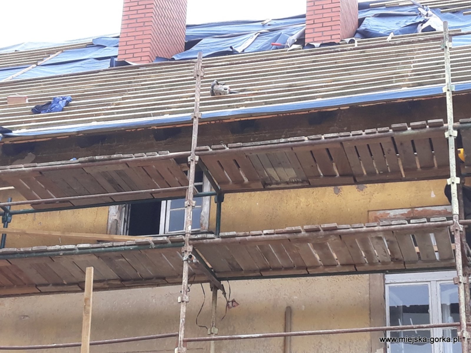 Remont rozpoczęto od wymiany dachu i przemurowania kominów. Zakres prac obejmuje m.in.: wykonanie nowych elementów konstrukcyjnych dachu, nowego pokrycia z dachówki oraz orynnowanie.
